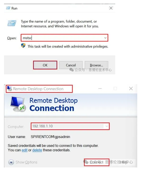 在Win10系统下使用“WIN+R”组合键快捷打开运行对话框,然后输入“mstsc”,点确定;输入GSS7000刚才设置的IP 地址:192.168.1.10,账户名:gpsadmin,密码:admin。进入后便可和本地电脑直接进行复制粘贴等文件传输操作。